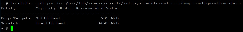 ‘localcli –plugin-dir /usr/lib/vmware/esxcli/int systemInternal coredump configuration check’