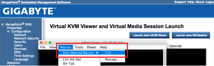 Another option for F# keys is to create a macro inside of the vKVM Viewer to pass the key. The screenshot below shows where you can setup user defined Macros and in the background is the MeregPoint console for one of my ESXi hosts.