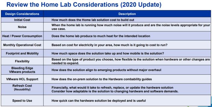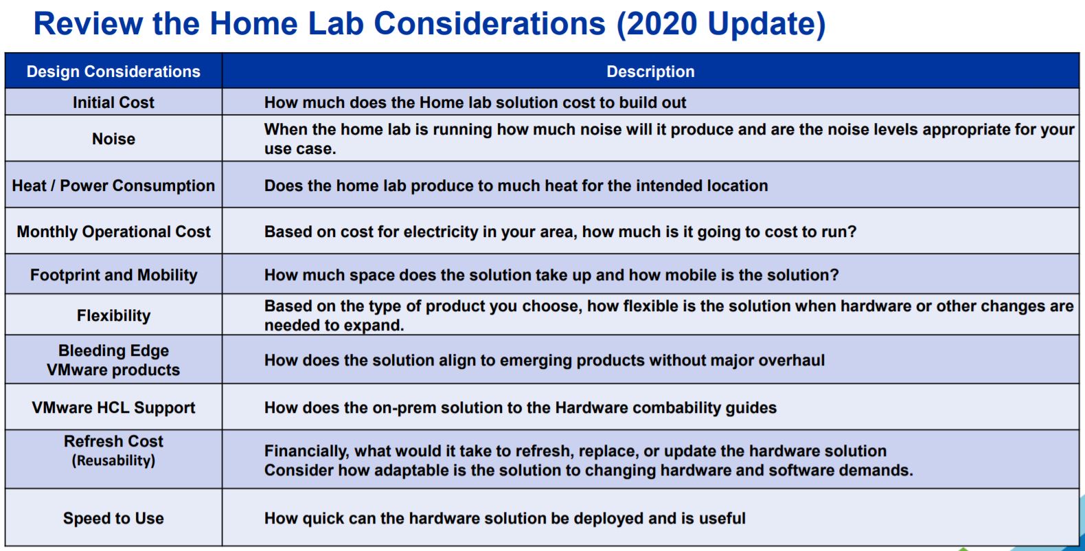 - Choose products that bring value to the goals, are cost effective, and if they are on the VMware HCL that a plus but not necessary for a home lab