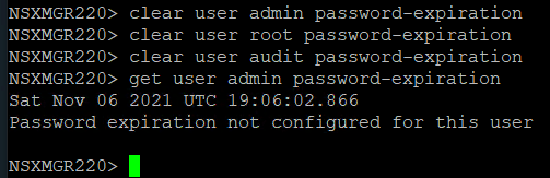 The following commands can be used to remove the password expiration policy. If you have multiple manager appliances, the commands only need to be executed on one node.