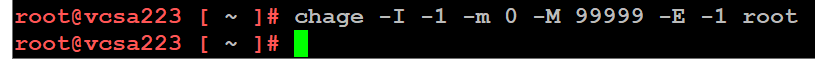 From this we can see that the password is set to never expire. To do this, I followed KB 32247 and step 14 had me enter the following command to ensure the password would not expire >> chage -I -1 -m 0 -M 99999 -E -1 root