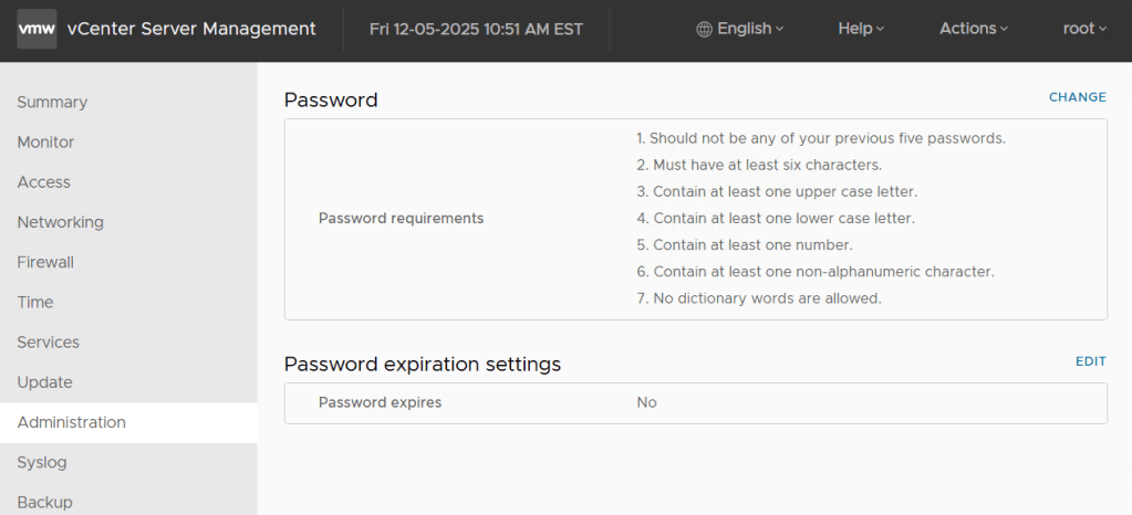 Additionally, under the VCSA Management console > Administration we can see what the current password requirements are, change the password, and change the Password expiration settings.