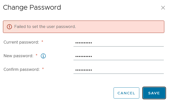 - VCSA Management GUI I try to change it to a remembered password and I get the following error.