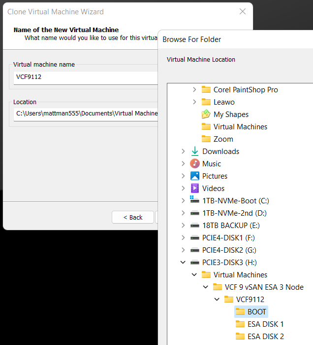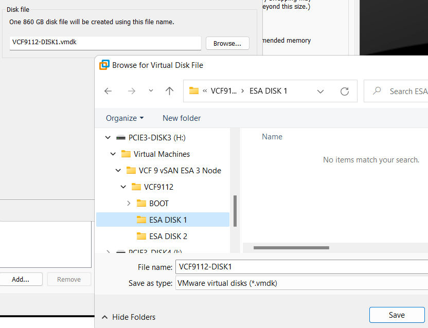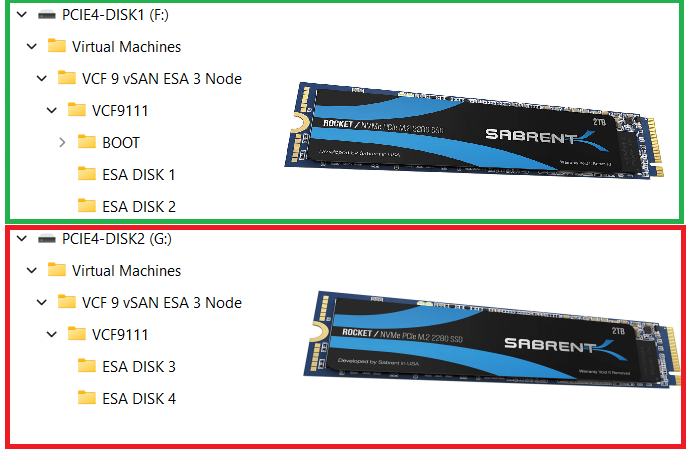 The 3 x ESX hosts in my VCF 9 Cluster will be using vSAN ESA. These nested ESX Hosts will have 5 virtual NVMe disks (142GB Boot, and 4 x 860GB for vSAN). Each host will have 2 physical 2TB NVMe Disks. At the physical Windows 11 layer I created folders for the 5 virtual NVMe disks for each Host. By doing this I have found it keeps my VMs more organized and running efficiently.