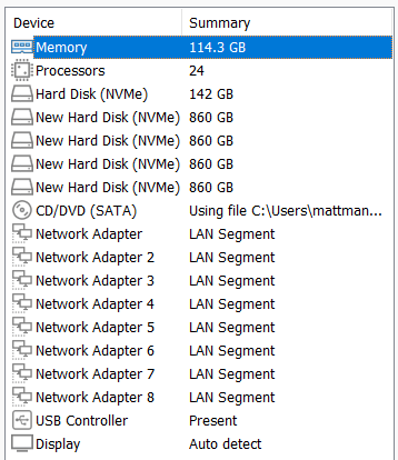My nested ESX Hosts have a lot of settings. From RAM, CPU, DISK, and networking there are tons of clicks per host which is prone to mistakes. The LAN Segments as an example entail 8 clicks per network adapter. That’s 192 clicks to set up my 3 ESX hosts. Templates cover about 95% of all the settings, the only caveat is the disk deployment. Each host has a unique disk deployment which I cover below.