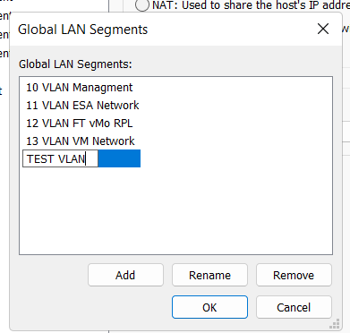 Prior to creating a Workstation VM Template I need to create my LAN Segments. Workstation LAN Segments allow VLAN traffic to pass. VLANs are a requirement of VCF 9. Using any Workstation VM, choose a network adapter > LAN Segments > LAN Segments Button. The “Global LAN Segments” window appears, click on Add, name your LAN Segment, and OK when you are done.