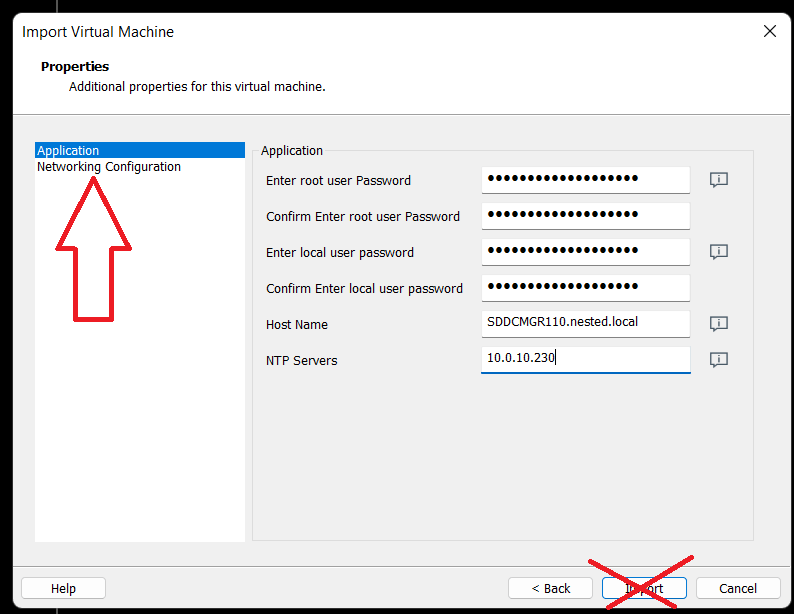 Fill in the passwords, hostname, and NTP Server. Do not click on Import at this time. Click on ‘Network Configuration’.