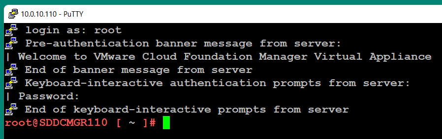 From the Windows AD server or other device on the same network, putty into the VCF Installer Appliance.