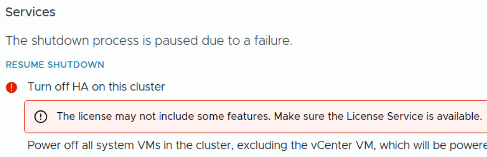 | 12 – You use the vSAN shutdown cluster wizard in the vSphere Client to shut down gracefully the vSAN clusters in a management domain. The wizard shuts down the vSAN storage and the ESX hosts added to the cluster. – Identify the cluster that hosts the management vCenter for this management domain. – This cluster must be shut down last. – Log in to vCenter for the management domain at https://vcsa234.nested.local/ui as a user with the Administrator role. – For a vSAN cluster, verify the vSAN health and resynchronization status. – In the Hosts and Clusters inventory, select the cluster and click the Monitor tab. – In the left pane, navigate to vSAN Skyline health and verify the status of each vSAN health check category. – In the left pane, under vSAN Resyncing objects, verify that all synchronization tasks are complete. – Shut down the vSAN cluster. In the inventory, right-click the vSAN cluster and select vSAN Shutdown cluster. – In the Shutdown Cluster wizard, verify that all pre-checks are green and click Next. Review the vCenter Server notice and click Next. – If vCenter is running on the selected cluster, note the orchestration host details. Connection to vCenter is lost because the vSAN shutdown cluster wizard shuts it down. The shutdown operation is complete after all ESXi hosts are stopped. – Enter a reason for performing the shutdown, and click Shutdown. | Shut Down vSAN and the ESX Hosts in the Management Domain OR Manually Shut Down and Restart the vSAN Cluster If vSAN Fails to shutdown due to a license issue, then under the vSAN Cluster > Configure > Services, choose ‘Resume Shutdown’ (Fig-3) |