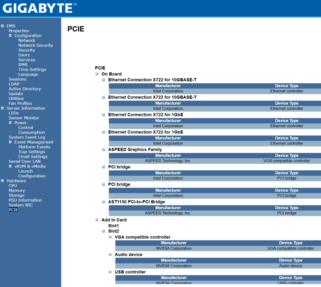 The Gigabyte mobo has a web based Embedded Management Software tool that allows me to ensure all hardware is recognized. After logging in I find the information under the Hardware section to be of value. The PCIe section seems to be the most detailed and it allows me to confirm my devices.