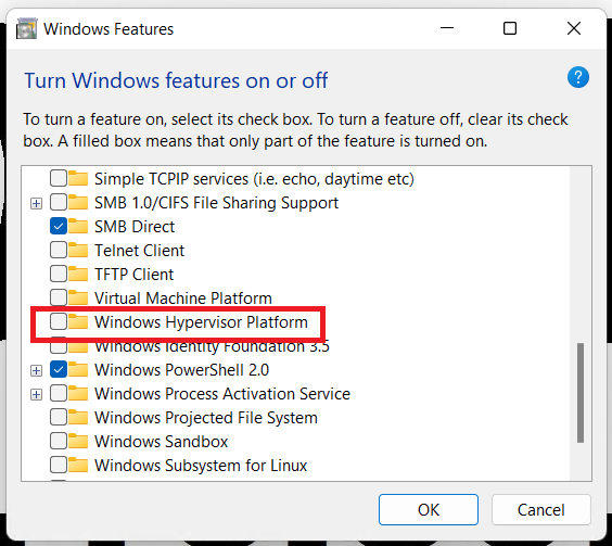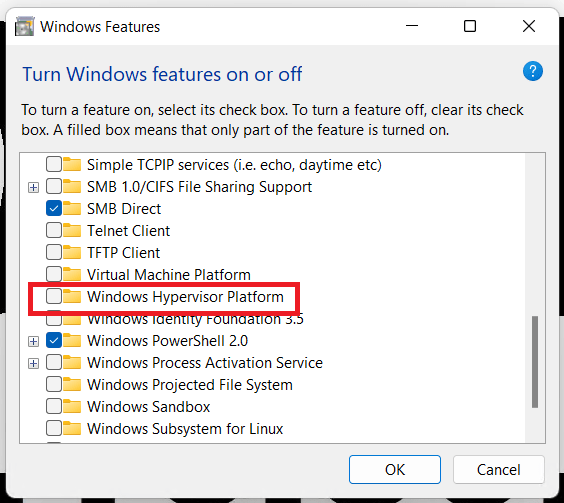 Before I install Workstation I validate that Windows Hyer-V is not enabled. I go into Windows Features, I ensure that Hyper-V and Windows Hypervisor Platform are NOT checked.