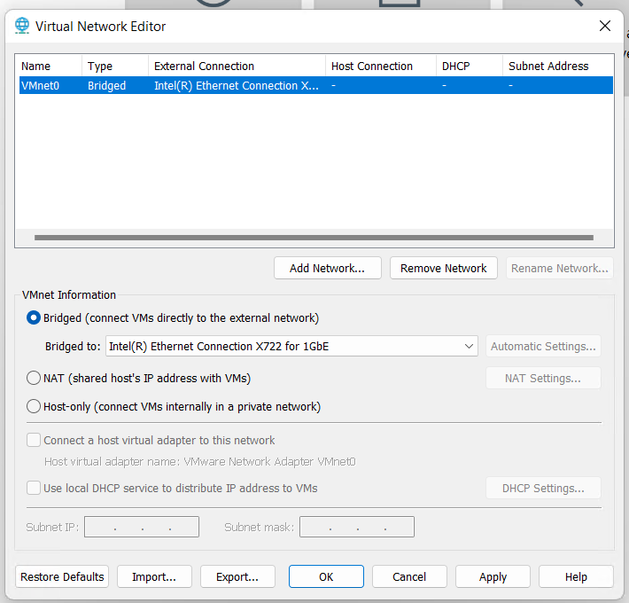 After Workstation has completed its installation, I open it up and go to Edit > Virtual Network Editor. I delete the other VMnets and adjust VMnet0 to match the correct network adapter.