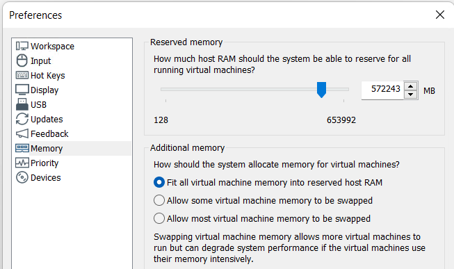 In my design I don’t plan to overcommit physical RAM (640GB ram) for my nested VM’s. To maximize the performance and ensure VMware Workstation uses the physical memory exclusively, I follow these steps to configure global preferences, individual VM settings, and the host configuration file.