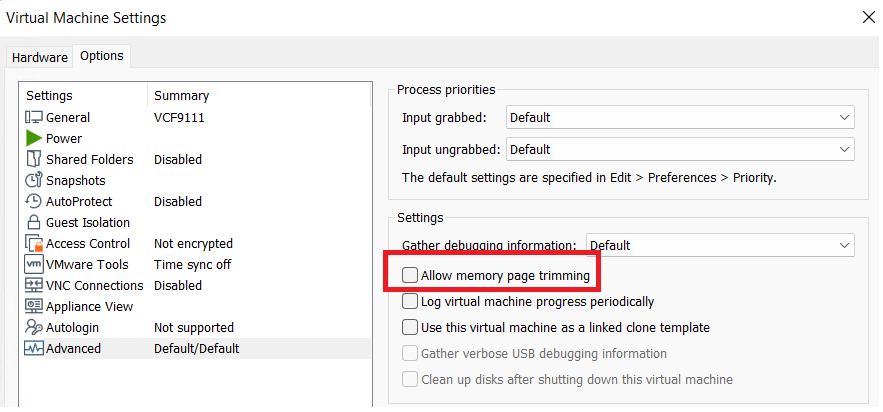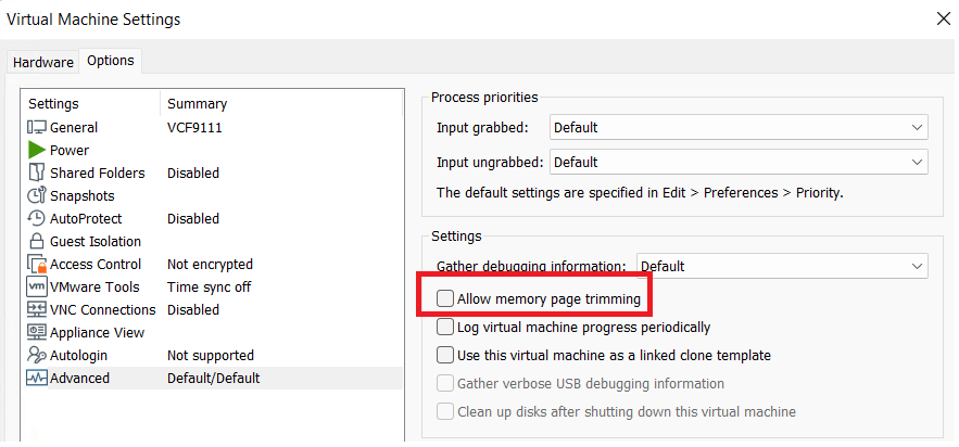 - Disable Memory Trimming for each VM: Windows and VMware use “trimming” to reclaim unused VM memory for the host. Since RAM will not be overallocated, I disable this to prevent VMs from ever swapping to disk.