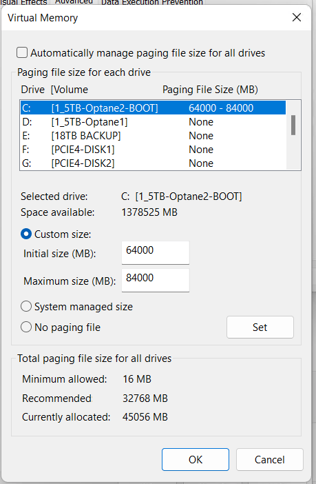 - Windows Page Files: With 640GB of RAM Windows 11 makes a huge memory page file. Though I don’t need one this large I still need one for crash dumps, core functionality, and memory management. According to Microsoft, for a high-memory workstation or server, a fixed page file of 16GB to 32GB is the “sweet spot.” I’m going a bit larger.