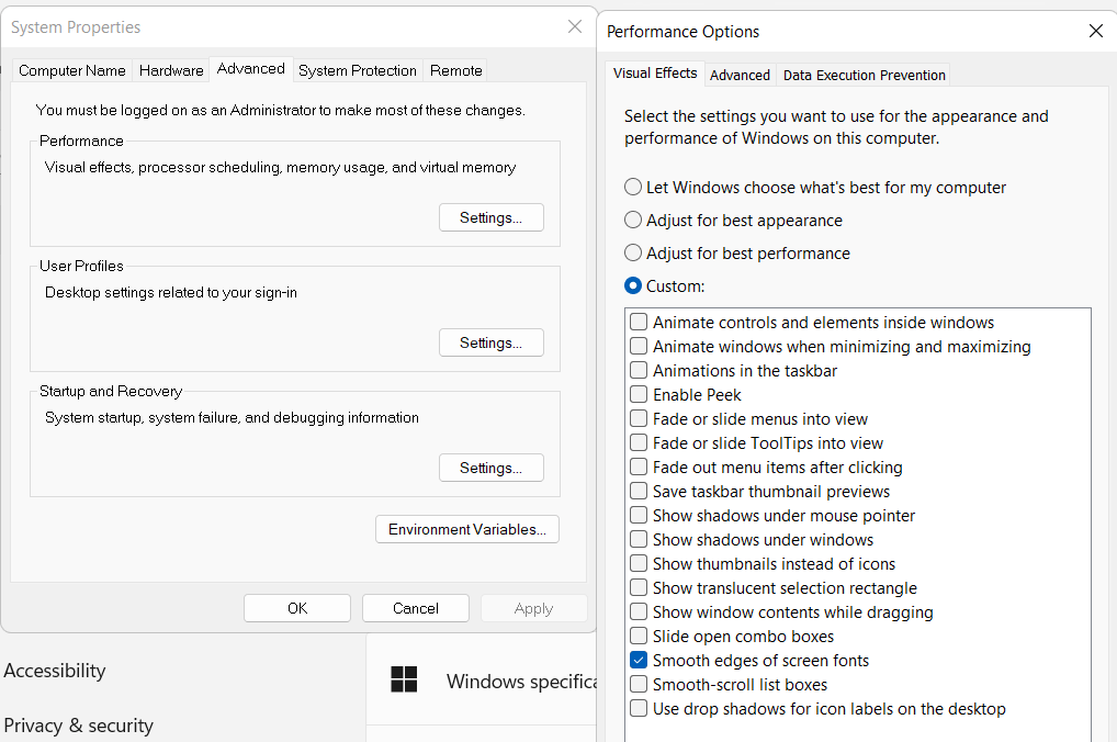 The visual effects in Windows 11 can be very helpful but they can also minimally slow down your performance. I prefer to create a custom profile and only enable ‘Smooth edges of screen fonts’