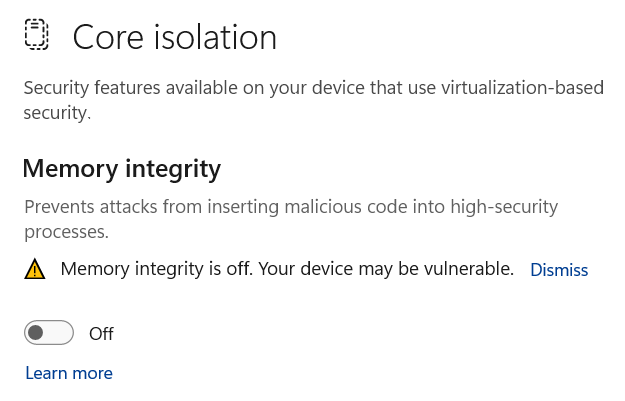 - Toggle the switch for Memory integrity to Off.