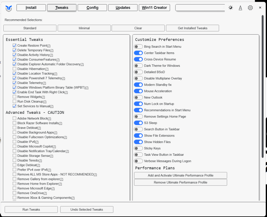 There are several standard Windows based features, software, and cleanup tools that can impact the performance of my deployment. I prefer to run tools that help optimize Windows due to their ability to complete tasks quickly. The tool I use to debloat and clean up my system is Winutil. It’s been a proven util for not only optimizing systems, installing software, updates, but helping to maintain them too. For more information about Winutil check out their most recent update.