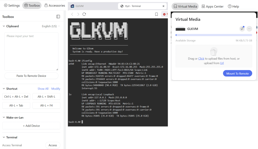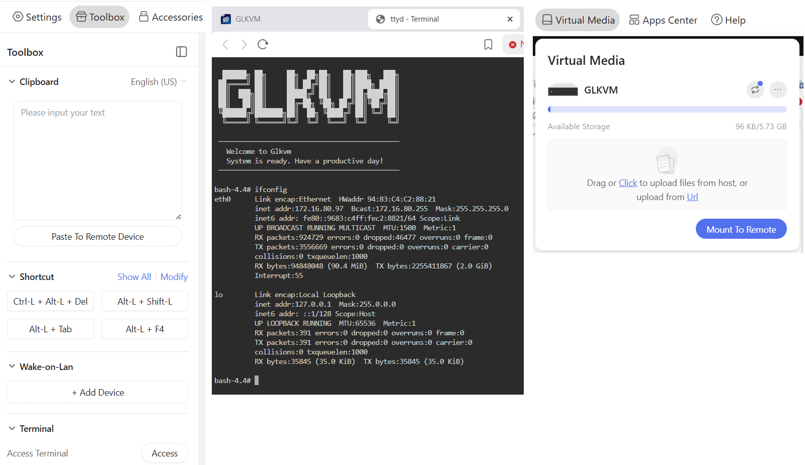 - Toolbox feature: (Fig-1): The Clipboard allows for pasted text to be pasted into a remote device. It also has keyboard shortcuts, WOL, and Terminal access
