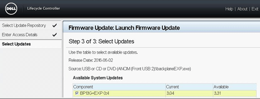 To update the Backplane Expander and Non-Backplane Expander you will need to boot the server into the Lifecycle Controller at boot time. Then I choose to use a USB key to update the firmware.
