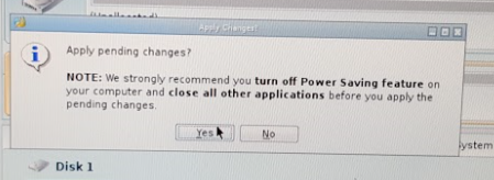 After choosing ‘Delete All Partitions’ for all my disks I clicked on ‘Apply’ in the upper right-hand corner. The following window appeared, I choose ‘Yes’ to Apply pending changes, and it removed all my partitions on all my disks quite quickly.