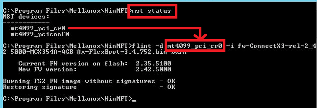 Once you confirm Windows device functionality then install the Mellanox Firmware Tools for windows (aka WinMFT)