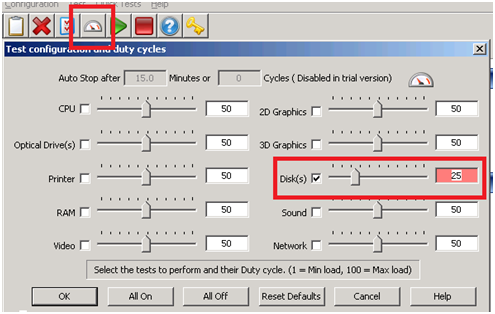 I launched the BurnIn Test, clicked on Preferences, uncheck all, checked Disks, and entered a duty cycle of 25