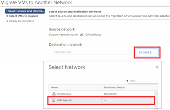 Second I chose BROWSE > a new pop up window appeared and I chose the vSS Port group that I wanted to migrate to then selected ok > I confirmed the ‘Destination Network’ was correct then clicked on next