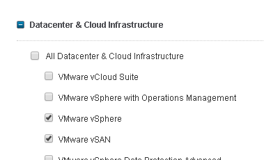 - You’ll find vSAN under ‘Datacenter & Cloud Infrastructure, simply choose it and/or other products, then click on save