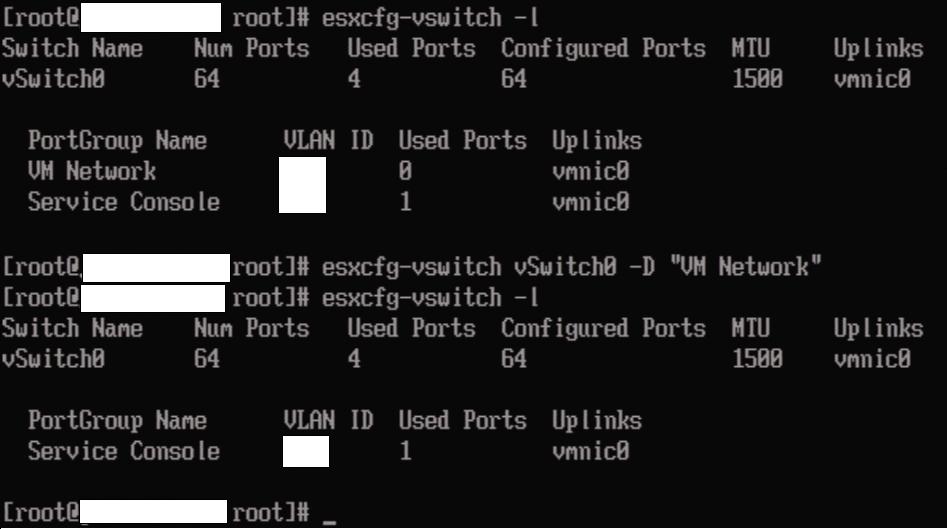 Esxcfg-vswtich vSwitch0 –D “VM Network” – Actually Removes it