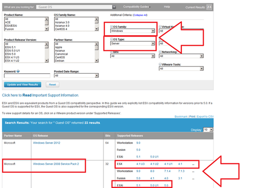 Click here to go to the VMware Compatibility Guide, Select your OS Family, OS Type and choose Update & Review…