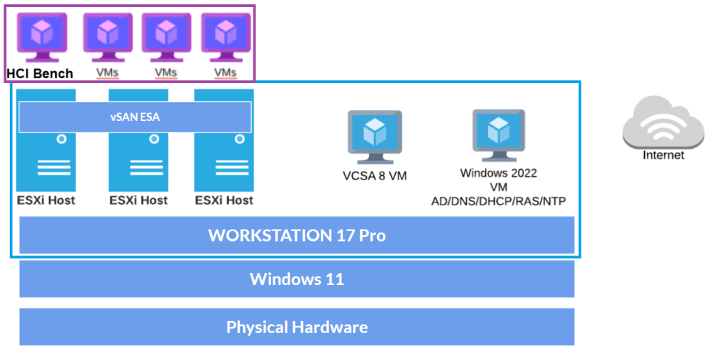 This revitalization follows my designs that were published on my Workstation Home Lab YouTube series. That series focused on building a nested home lab using Workstation 17 and vSphere 8. Nesting with Workstation can evoke comparisons to the movie Inception, where everything is multi-layered. Below is a brief overview of my Workstation layout, aimed at ensuring we all understand which layer we are at.