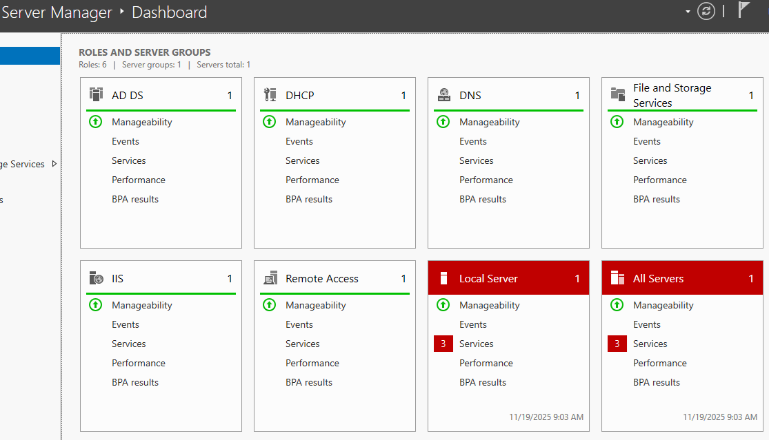 - The Win2022 Server has the following services: AD, DNS, DHCP, and RAS