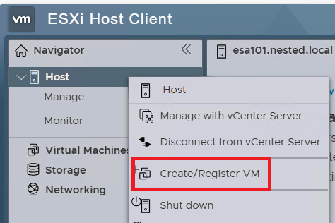 Once completed, I open up the ESXi Host Client on the target host. Then I right click on Host and choose Create/Register VM.