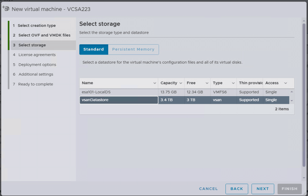 - I check the HDD size of the VCSA VM (~120GB Used) and ensure I have enough vSAN Storage (~3TB Free) to support it.