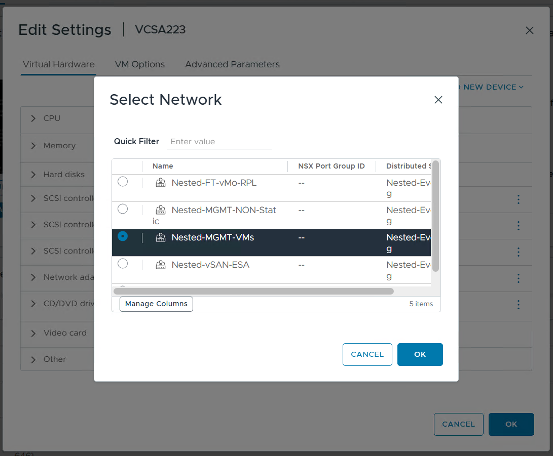 Once the transfer is complete and I boot the VCSA server. Once it is ready I log into it via the vSphere Client. From there I right click on the VM > Settings > Network Adapter > Browse Network and choose the Static bound Port Group.