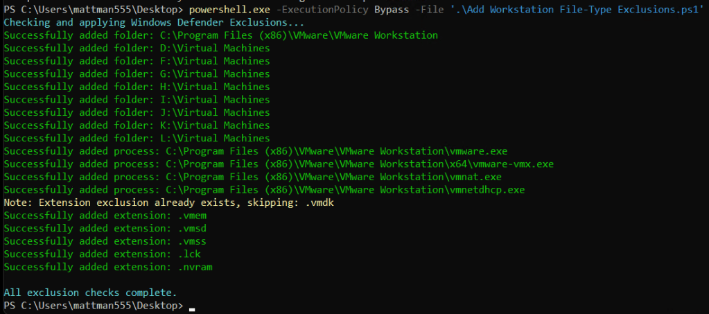 - Script: Use a script to create AV Exceptions. For an example check out my blog – Using PowerShell to setup AV exceptions for Workstation 25H2u1 and Windows 11.